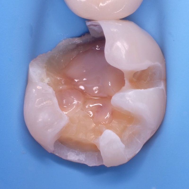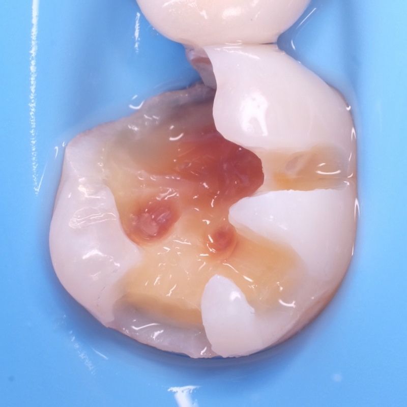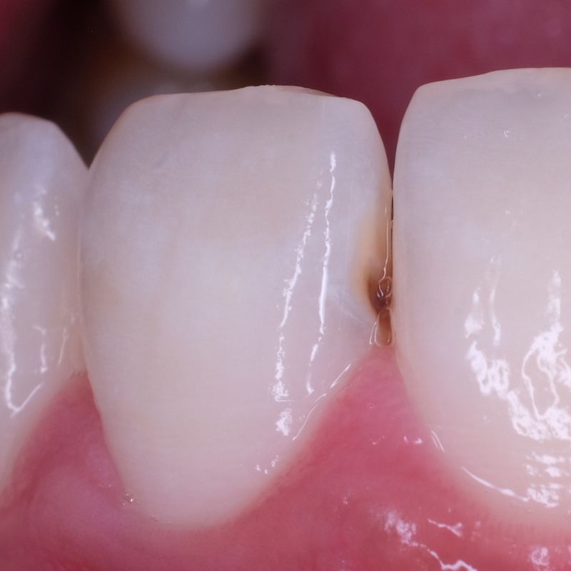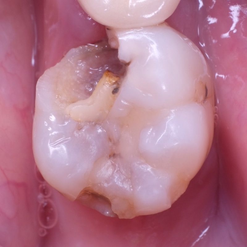 Даже при наличии глубокой полости с размягченным дентином она может быть прикрыта «скорлупой» эмали и длительно находиться в труднодоступном для внешних раздражителей месте, например, на одной из контактных стенок зуба возле десны (то есть в межзубном промежутке). Только после отлома или откола значительной части эмали над кариозной полостью возможно классическое проявление острого глубокого кариеса с характерной для этого клиникой.