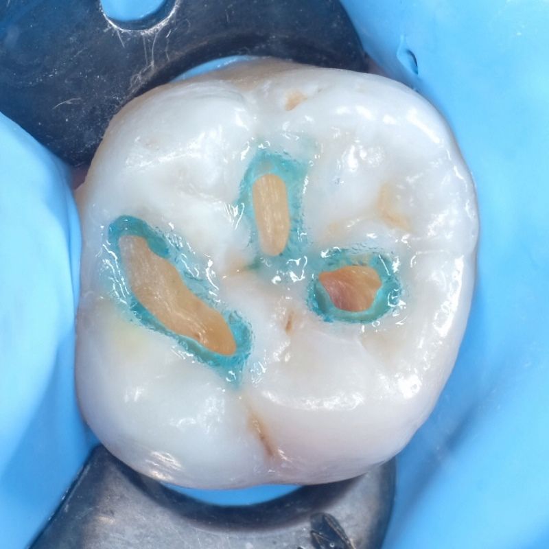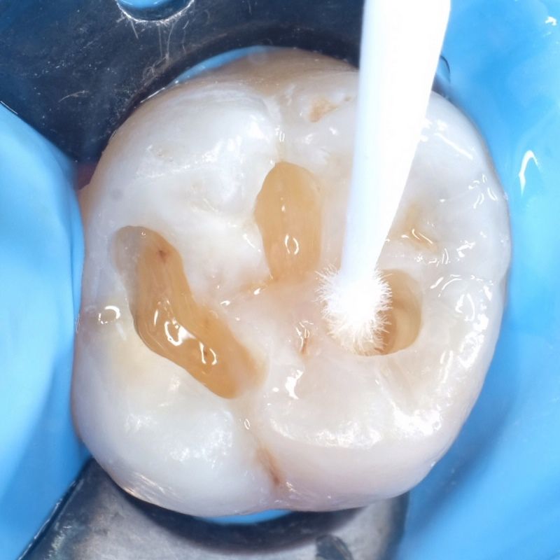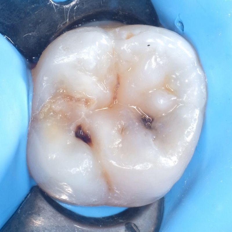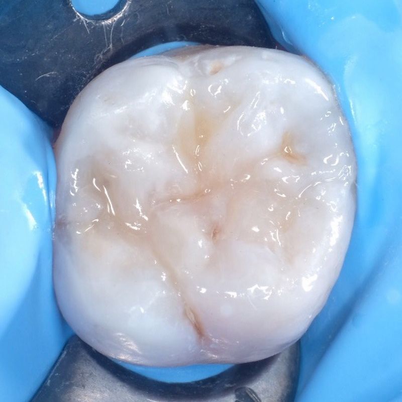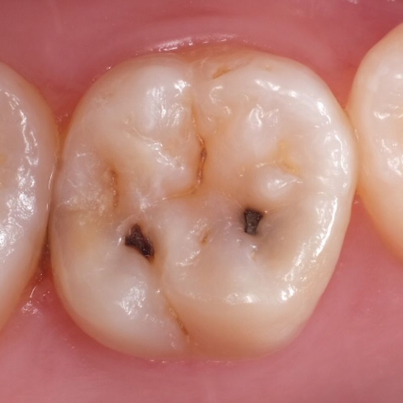Фиссуры сами по себе имеют более темный оттенок, чем остальная поверхность эмали зуба. Это связано с тем, что они заполнены налетом, зубными бляшками, которые невозможно полностью удалить зубной щеткой, да и просто находятся в углублениях в тени бугров зуба. Все это часто маскирует фиссурный кариес и затрудняет его выявление.