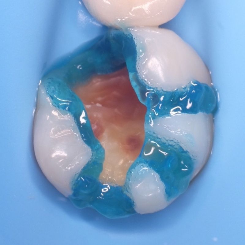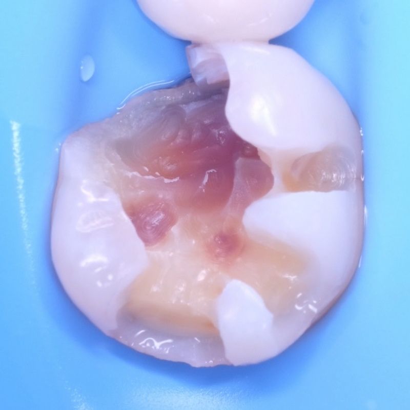 Острый глубокий кариес характеризуется кратковременными болями от разнообразных раздражителей. Часто полость имеет глубокий и узкий вход с широким основанием. Если бы вы могли поскрести стенки такой полости чем-то твердым (а стоматологи на приемах это делают регулярно), то заметили бы, что со стенок полости всегда обильно отделяется пластами размягченный инфицированный и пигментированный дентин.